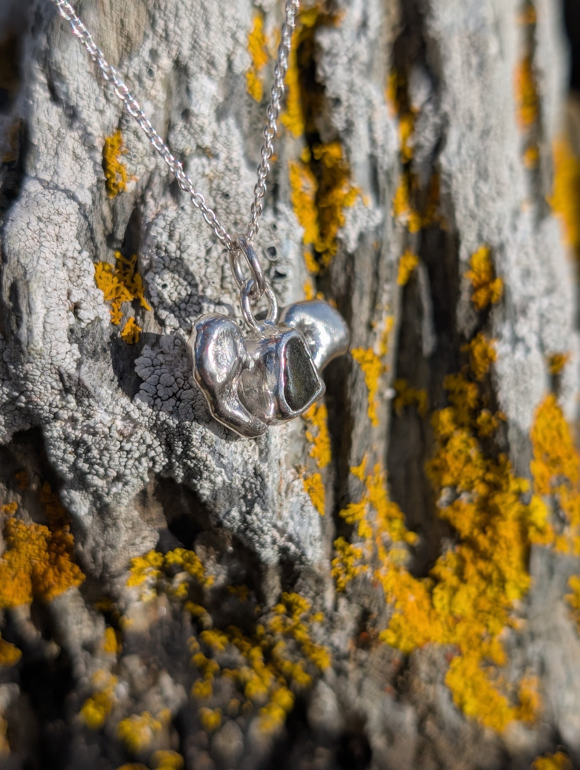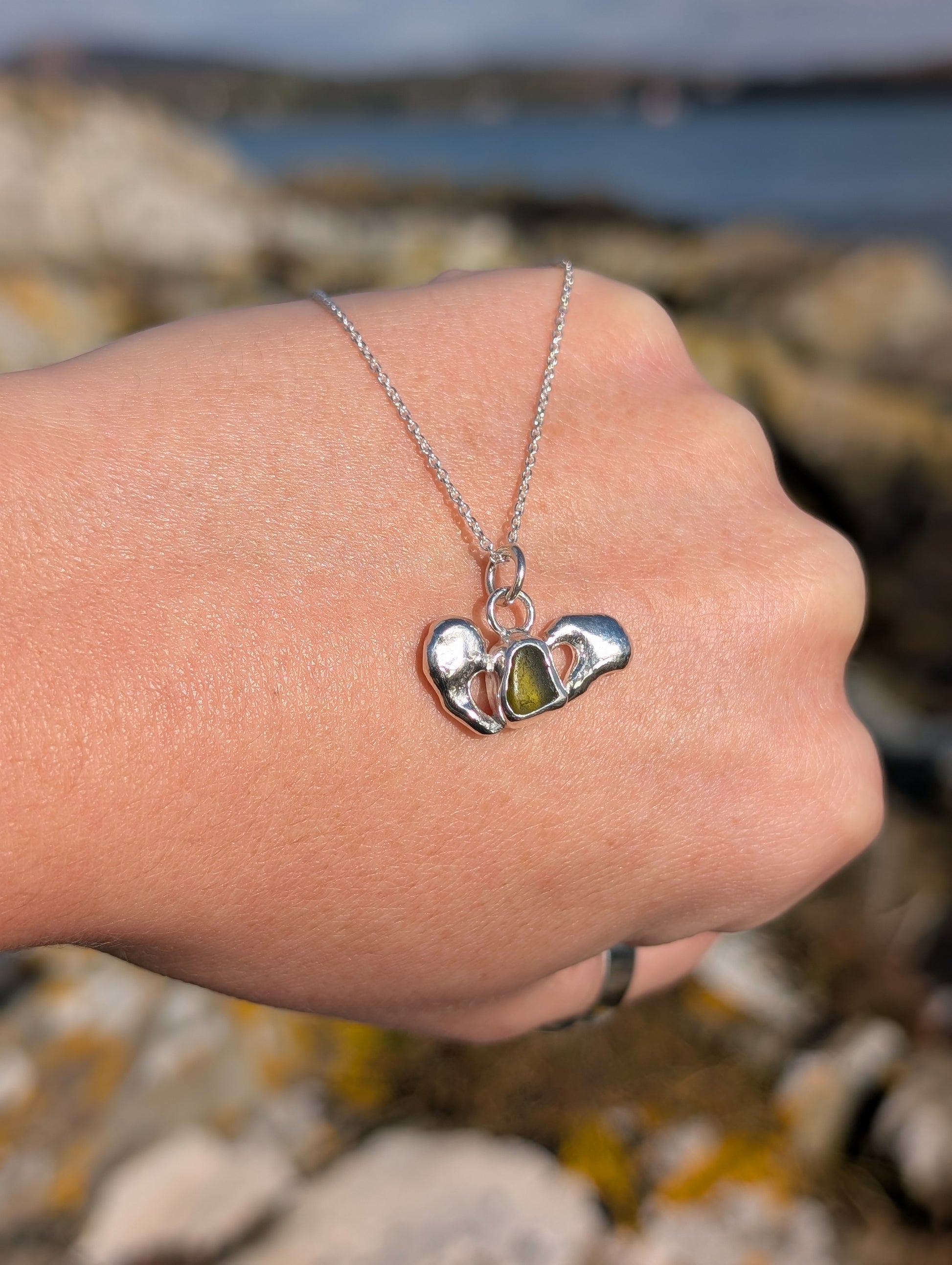 A deep green sea glass droplet held within an organic silver heart. Made with sea glass found in Schull, West Cork this unique piece elegantly hangs on a delicate silver chain. Like water, the silver flows into an organic heart shape cradling the sea glass beautifully.