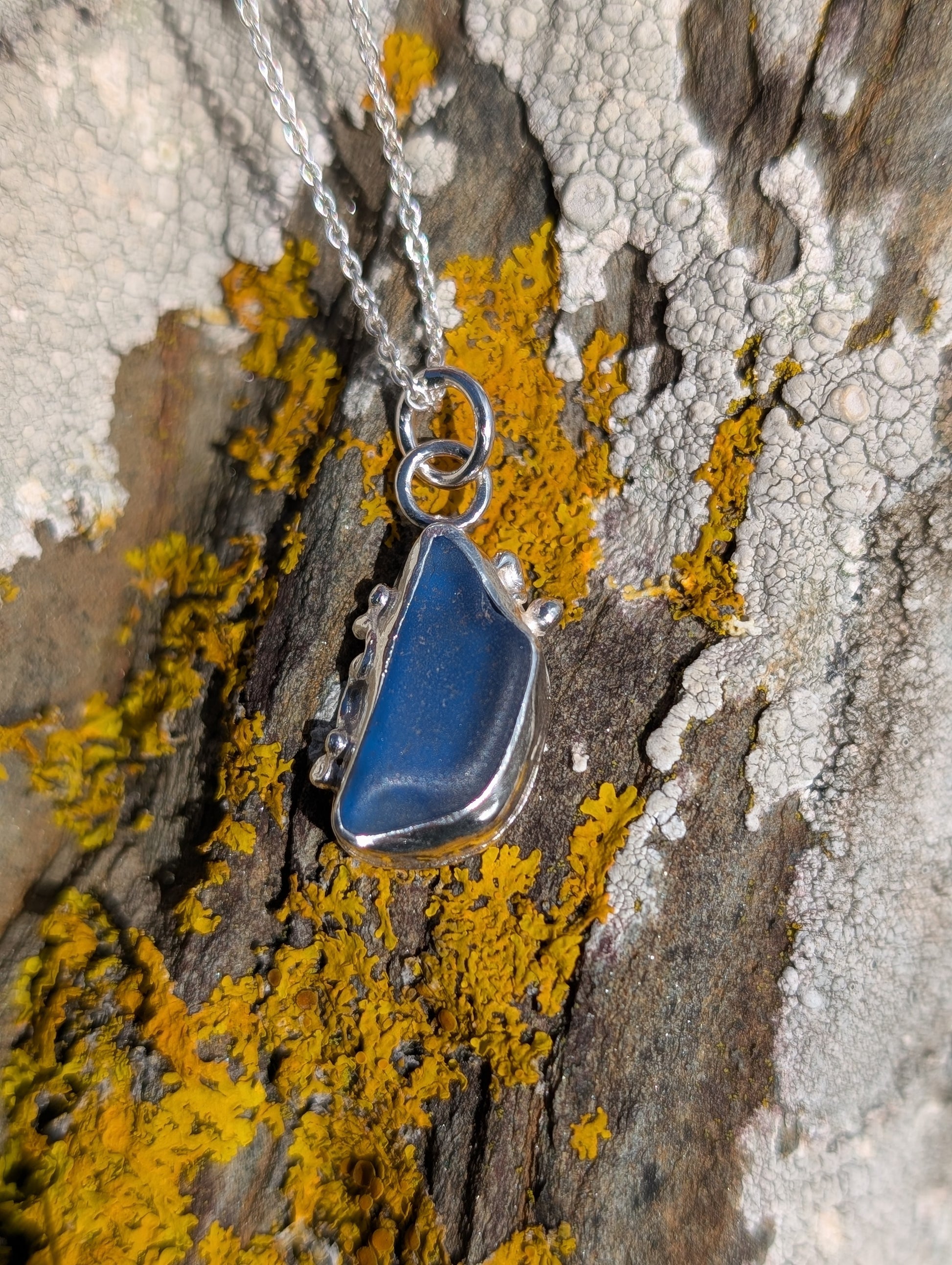 This one-of-a-kind pendant is inspired by the organic shapes found in the sea. Bright royal blue sea glass is nestled in a sterling silver bezel with carefully handcrafted organic embellishments. The unique pendant hangs on a delicate silver chain. Handmade with sustainability in mind this necklace is made from 100% recycled silver.