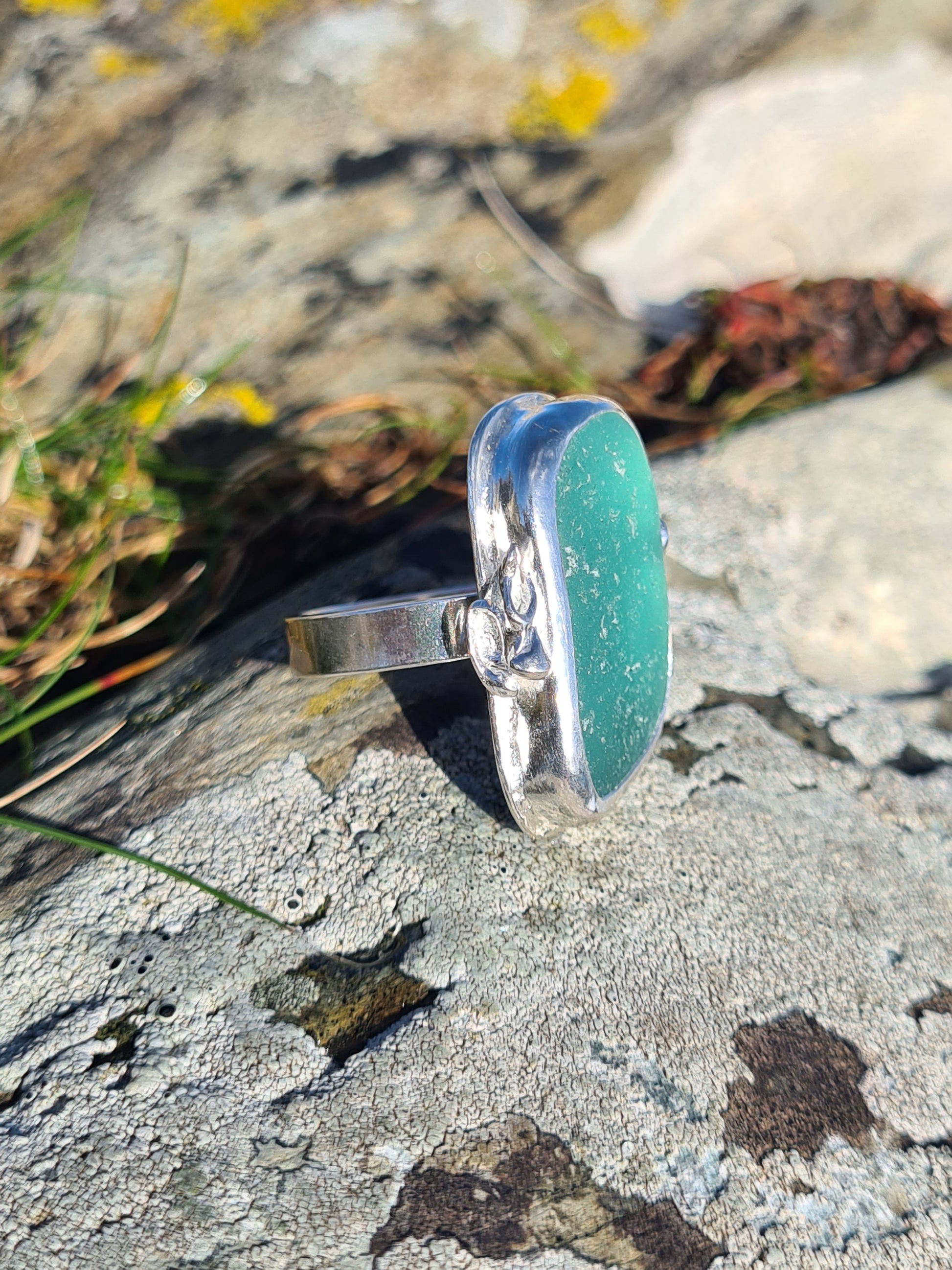 This unique chunky ring is inspired by the organic shapes found in the sea. A rare large piece of turquoise sea glass is nestled in a sterling silver bezel decorated with organic embellishments and set upon a thick band. Crafted with sustainability in mind this handmade silver ring is made from 100% recycled silver.